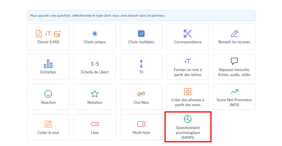 Cliquez sur Créer un quiz et choisissez le type de question MMPI.