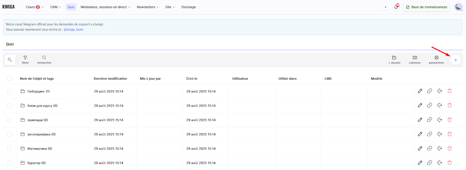 Accédez au menu Quiz dans votre compte Kwiga. Cliquez sur le bouton + pour créer un nouveau quiz.