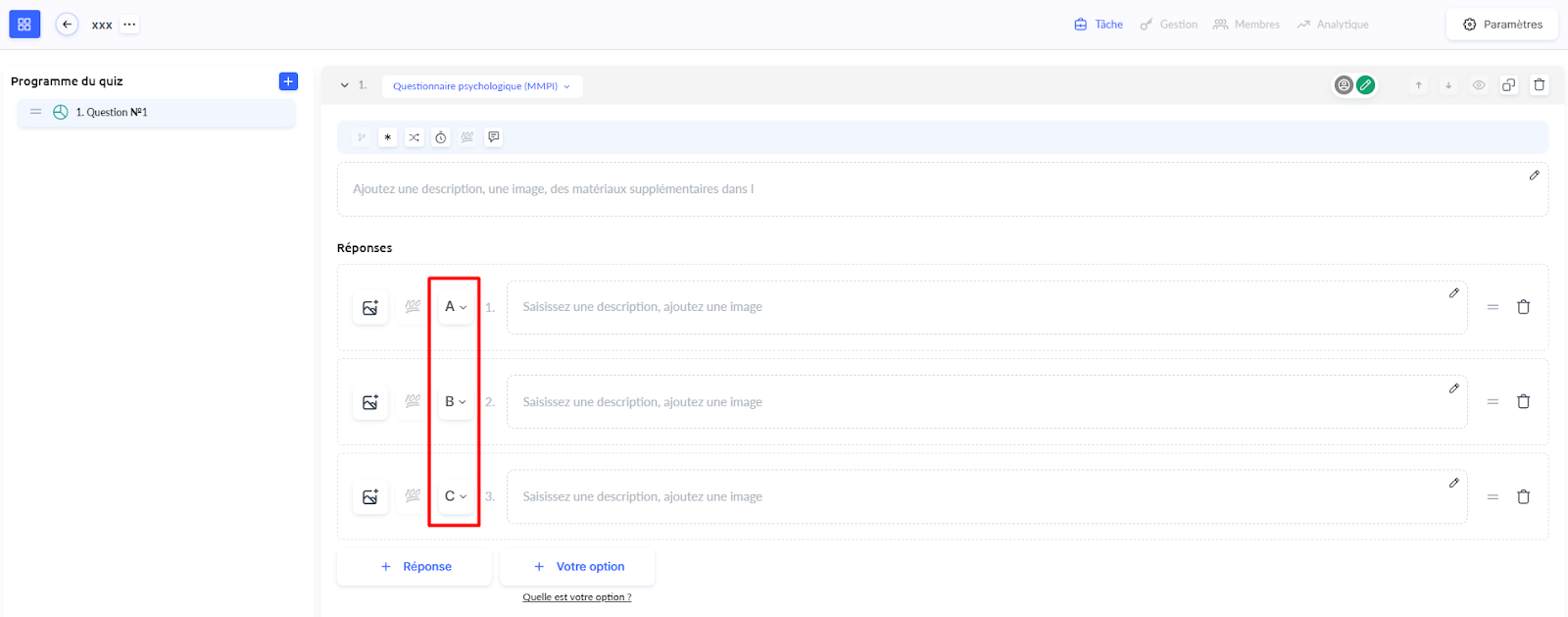 Ajoutez les options de réponse et attribuez-leur des lettres à partir du menu déroulant. La plateforme propose par défaut A, B et C, mais vous pouvez les modifier selon la logique de votre test.