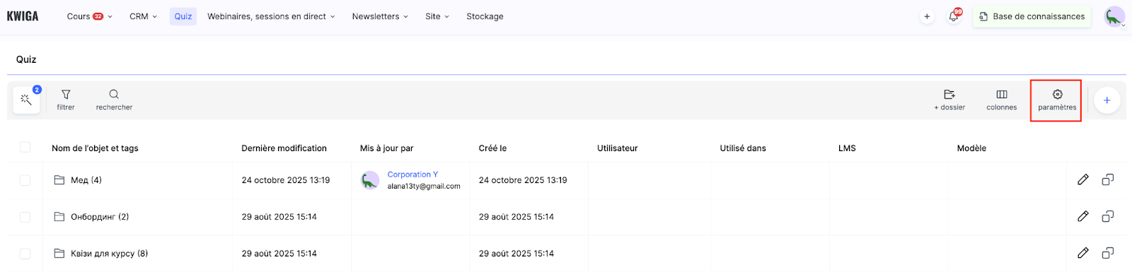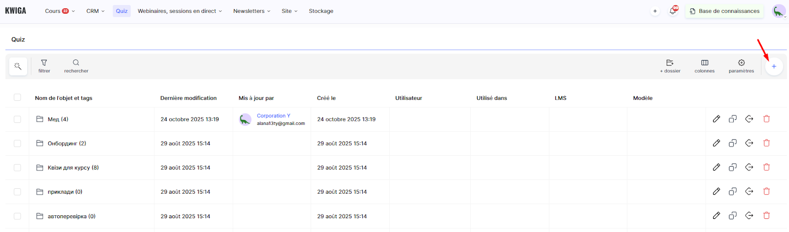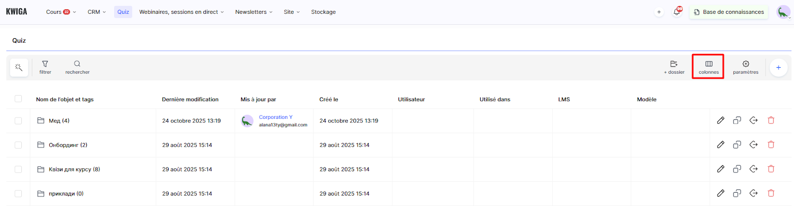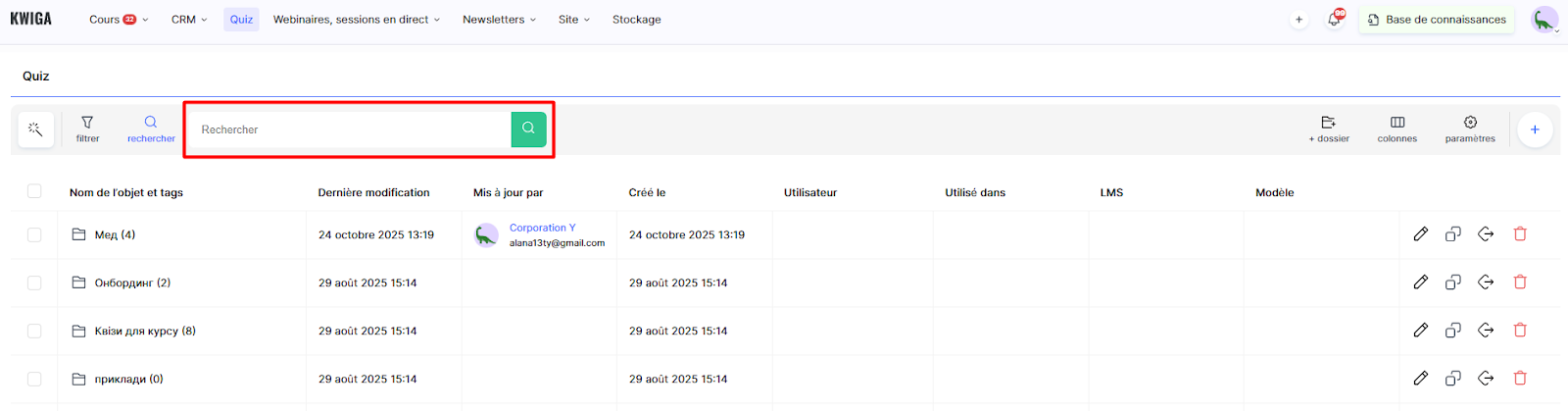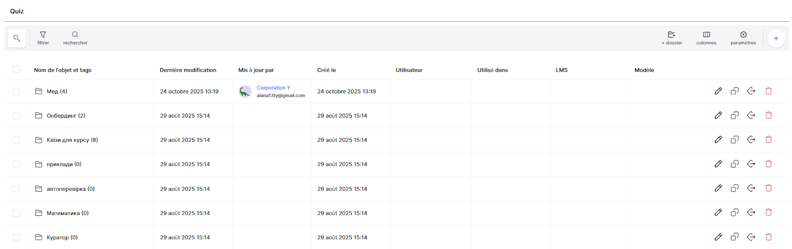 La plateforme enregistre également les Dernières modifications : la date des dernières modifications et la personne ayant mis à jour un quiz donné. Cela est utile dans le cadre du travail en équipe, lorsqu’il est important de savoir qui a modifié une tâche et quand. De la même manière, les colonnes Créé (date de création) et Utilisateur (auteur du quiz) sont affichées.