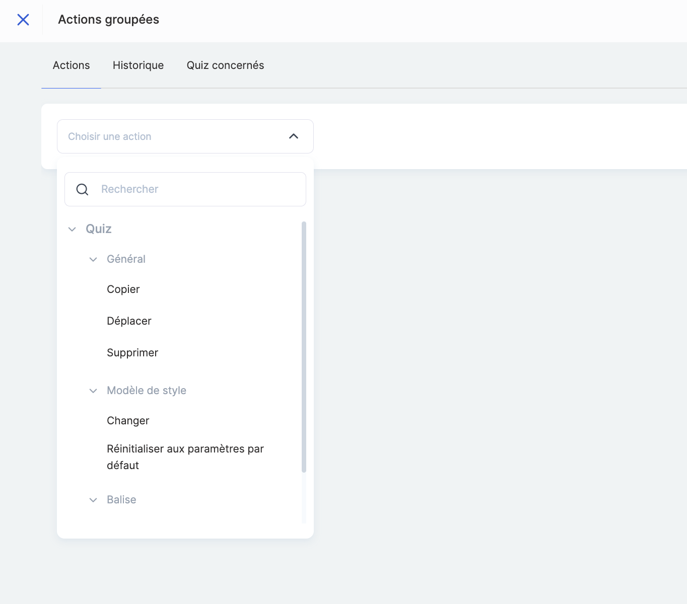 Pour gérer efficacement plusieurs quiz à la fois, des actions en masse sont disponibles. Sélectionnez les quiz nécessaires dans la liste, cliquez sur l’icône des actions en masse et choisissez l’option souhaitée dans le menu.