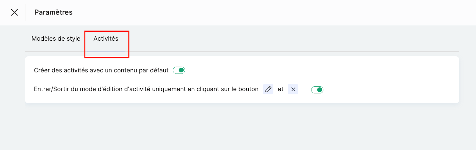 Dans l’onglet Activités, vous pouvez définir les paramètres qui déterminent le comportement de la plateforme lors de la création et de la modification des quiz :