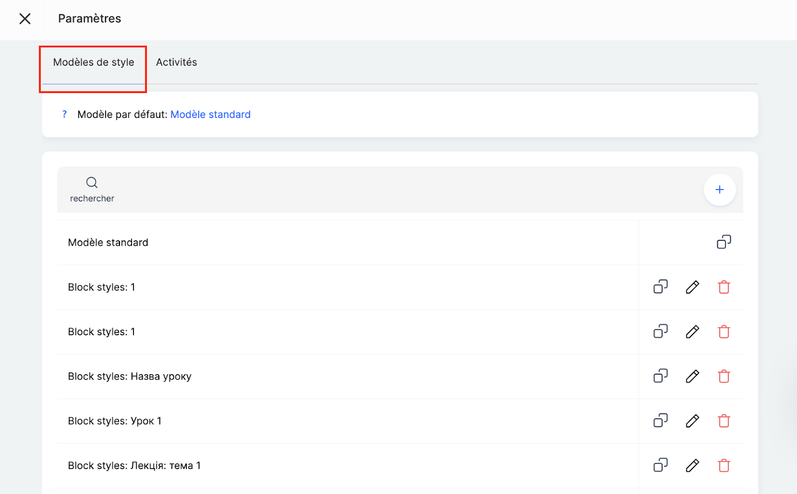 Dans cet onglet, vous pouvez configurer les modèles existants, en créer de nouveaux et sélectionner un modèle par défaut qui sera appliqué à tous les nouveaux quiz.