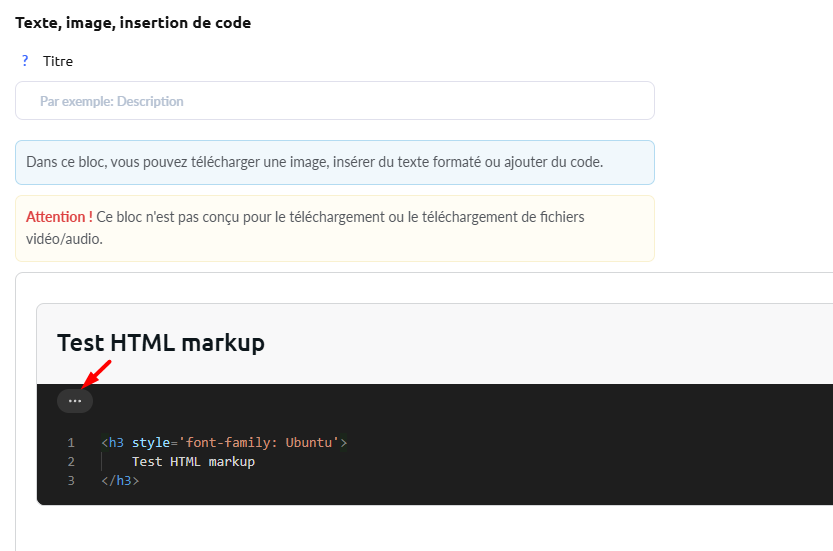 Ouvrez la leçon dans laquelle vous souhaitez ajouter un bouton et insérez l’élément « Texte, Image, Intégration de code ».