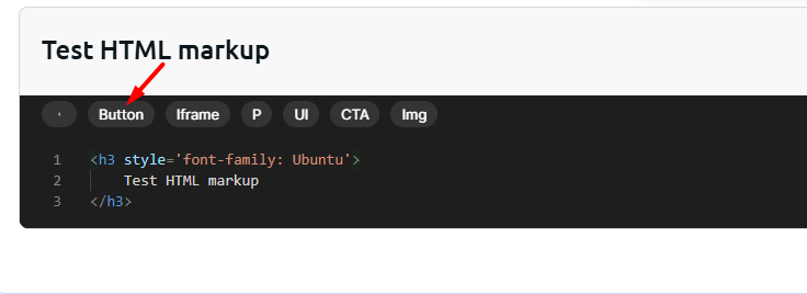 L’éditeur de code s’ouvrira (une zone noire à l’écran) et, en haut du menu, vous verrez des boutons permettant d’ajouter des modèles de code prêts à l’emploi. Pour créer un bouton, sélectionnez Bouton :