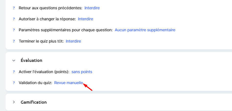 Pour les devoirs nécessitant une vérification manuelle, vous devez activer l’option Validation — par un tuteur dans les paramètres du quiz.