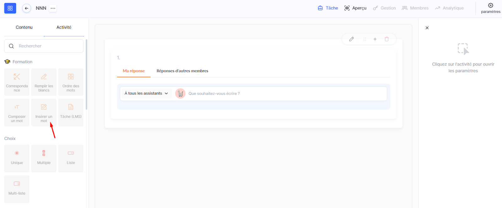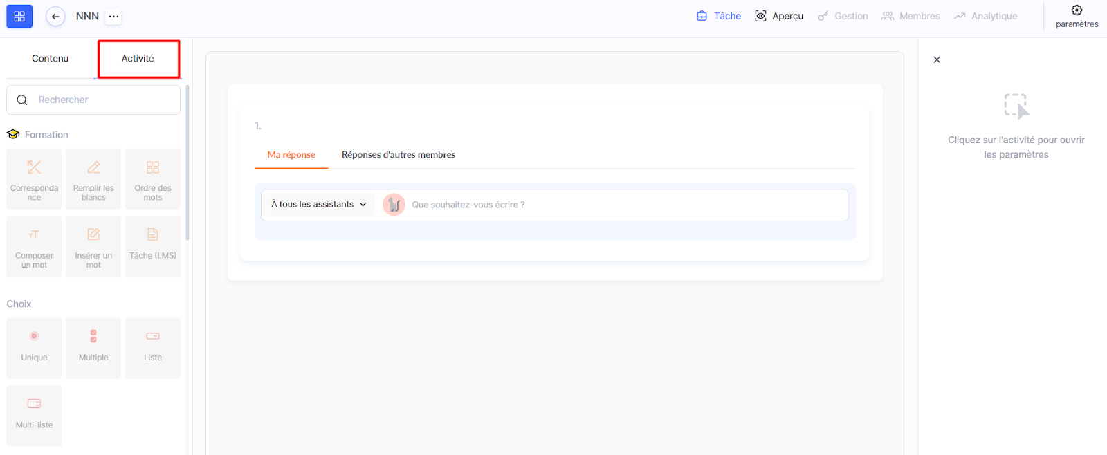 Complétez et configurez l’activité (questions, réponses, etc.).