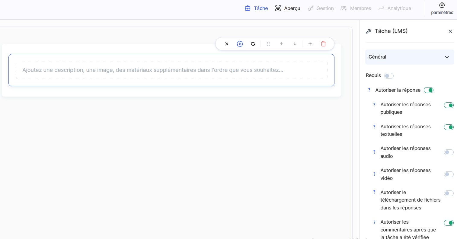 Recommandation : Pour le type Devoir (LMS), il n’est pas possible d’ajouter plusieurs questions. Ce type est idéal si vous attendez une réponse développée ou si l’apprenant doit lire et répondre aux commentaires du tuteur après la révision.
