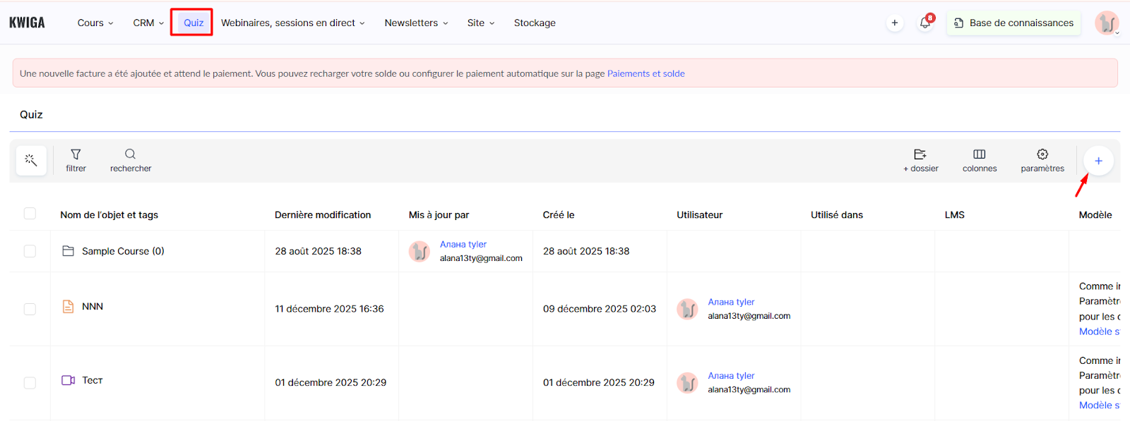 Il faut d’abord créer un devoir qui sera utilisé dans le cours. Les devoirs sont créés séparément du cours. Accédez à la section Quiz et créez un nouveau devoir.