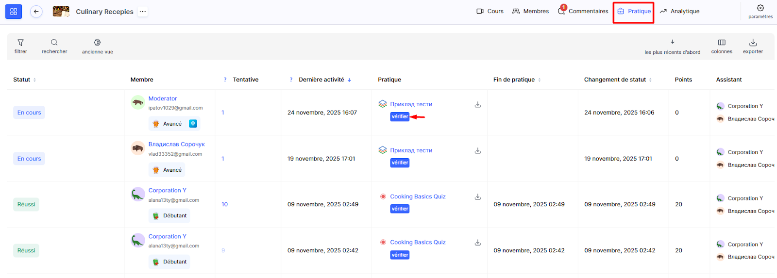 Une fois le devoir soumis, il devient accessible à la vérification dans le menu Pratique du cours.