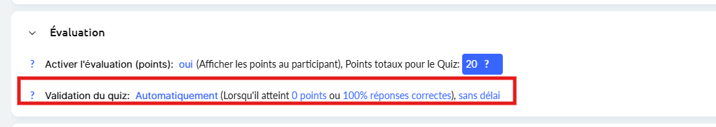 Paramètres de réussite et de validation — les conditions requises pour réussir le quiz