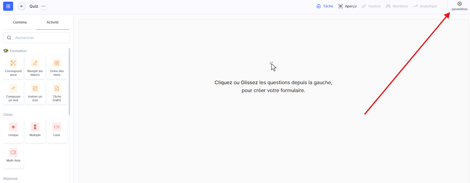 Découvrez tous les types de questions et activités disponibles dans l’article: Quiz, exercices pratiques : types de questions et activités.