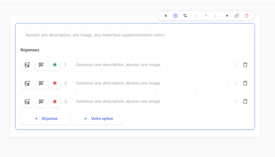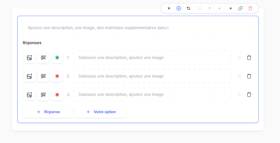 Sur la plateforme Kwiga,_toggle vous pouvez créer des quiz interactifs et attrayants en combinant différents types de questions au sein d’un même quiz. Cela vous permet d’adapter le test à vos objectifs et de le rendre plus efficace dans le processus d’apprentissage. Le nombre de questions dans un quiz n’est pas limité et leurs types peuvent varier librement.