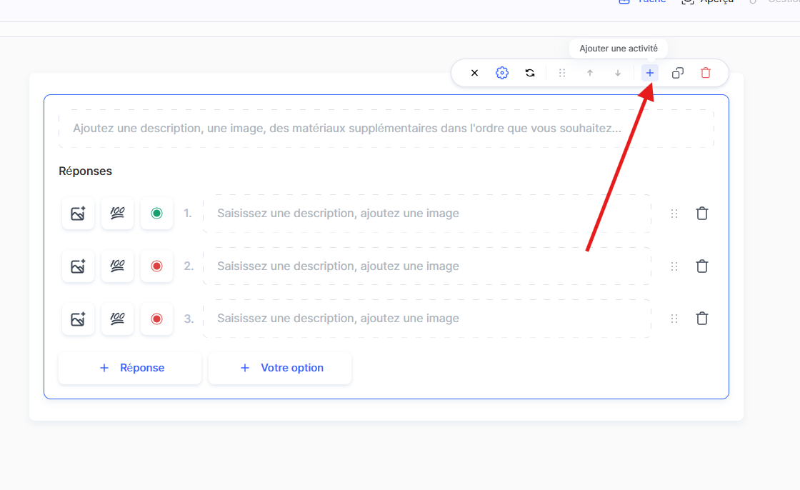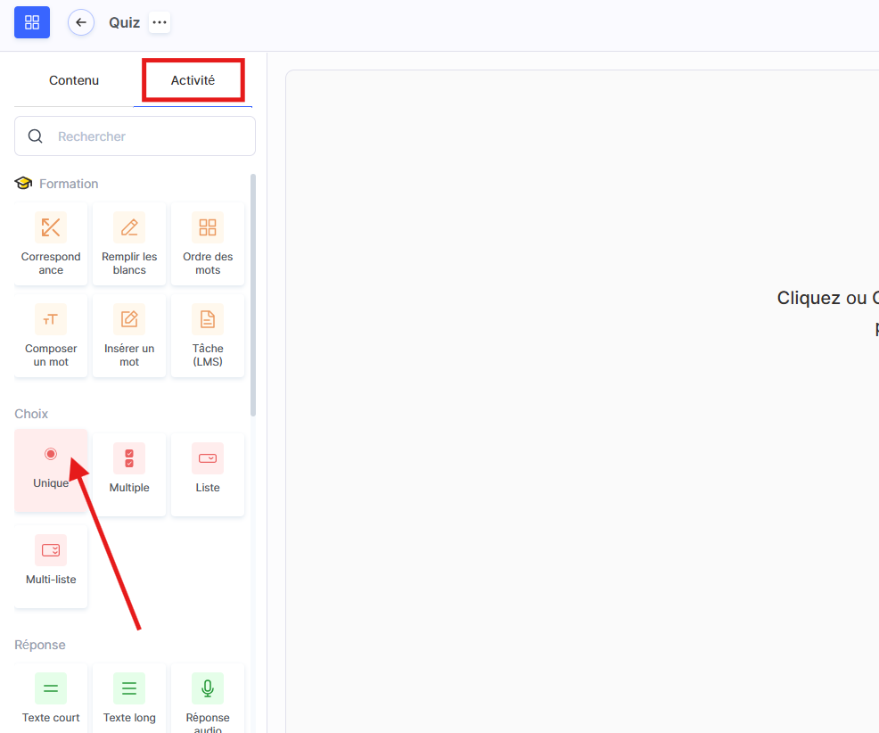 Chaque nouvelle question est ajoutée via le bouton + Ajouter une activité ou en cliquant sur le type de question sélectionné dans le panneau de gauche.