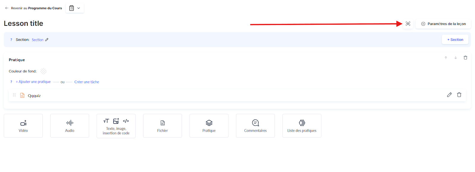 Pour ajouter un test à une leçon, ouvrez la leçon correspondante et ajoutez le quiz via le bloc prévu à cet effet.