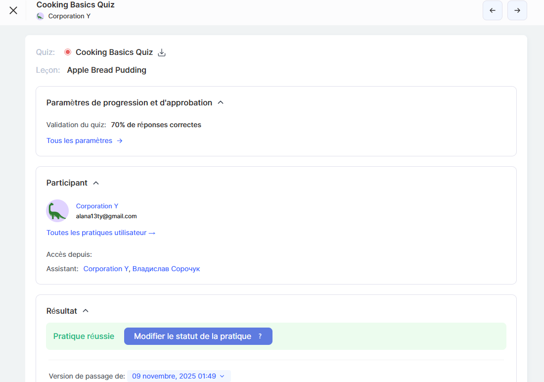 Les résultats sont validés immédiatement dès que les conditions spécifiées sont atteintes — par exemple un score minimal ou le pourcentage requis de réponses correctes. Cette solution est rapide et pratique.
