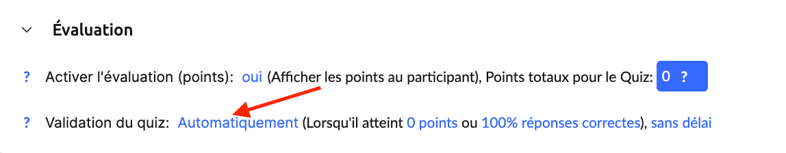 4. Dans les paramètres du quiz, définissez le paramètre Validation du quiz : sélectionnez Automatique. Vous pouvez également indiquer le pourcentage de réponses correctes requis pour l’acceptation automatique, par exemple, fixer 70 % comme seuil de réussite.