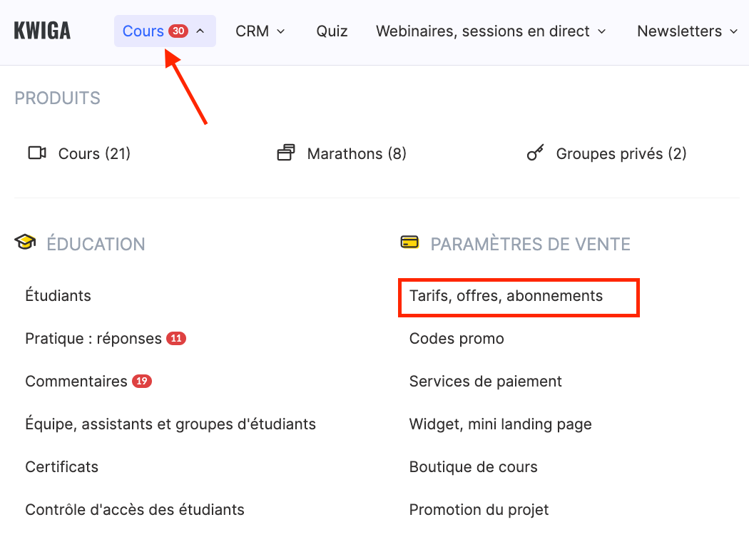 Une fois le cours créé, passez à la configuration des tarifs et des offres.