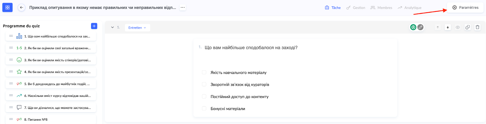 Ajoutez des questions en utilisant les types appropriés (par ex. choix multiple, texte à trous, réponse ouverte) et adaptez-les à vos besoins.