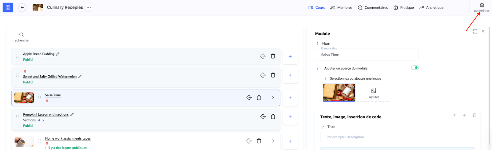 Pour définir les délais, accédez aux paramètres du cours ou quittez le constructeur de leçon individuelle. Ouvrez Paramètres