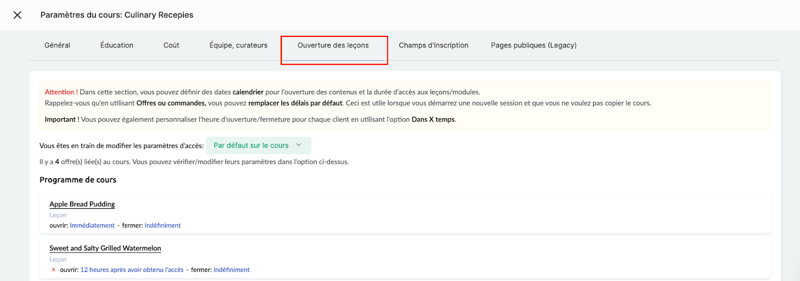 Remarque : si l’accès au cours est limité à une période précise (par exemple deux mois), il est recommandé de gérer les fermetures via les offres plutôt qu’en fixant des dates de fermeture pour chaque leçon ou module. Cette approche facilite la prolongation de l’accès pour les participants.