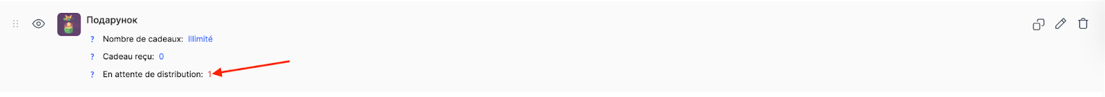 Affiche le nombre de contacts en attente de réception du cadeau. Ce champ s’applique uniquement aux cadeaux nécessitant une confirmation manuelle par l’administrateur. Lorsqu’un étudiant échange des points contre un tel cadeau, il est ajouté à ce compteur et y reste jusqu’à ce que l’administrateur confirme la livraison. Cela signifie que la récompense requiert une action supplémentaire de votre part, par exemple l’organisation de l’expédition d’un article physique ou la prise de rendez-vous pour une consultation individuelle.