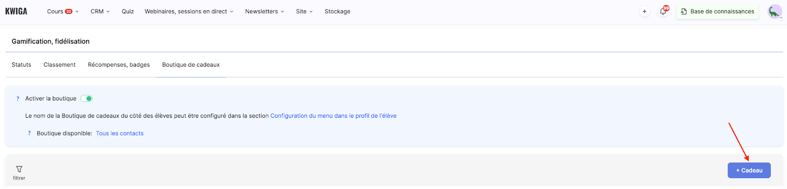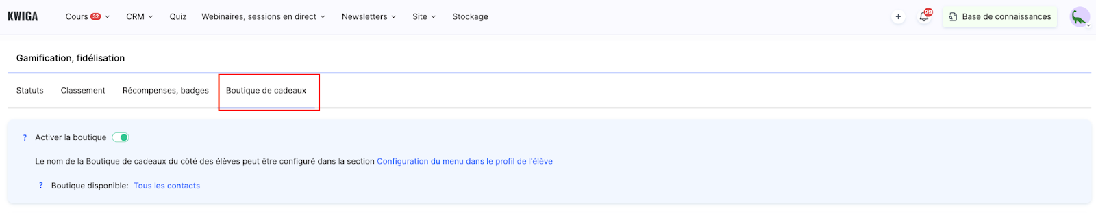 La boutique de cadeaux est un outil pratique de gamification sur la plateforme Kwiga qui vous permet de créer des récompenses pour motiver les étudiants. Cette fonctionnalité vous aide à stimuler l’activité en offrant aux étudiants la possibilité d’échanger les points accumulés contre différents cadeaux.