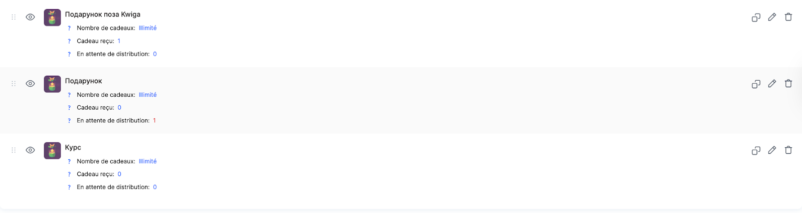 Pour chaque cadeau, les actions suivantes sont disponibles : gérer la visibilité pour les étudiants, dupliquer, modifier et supprimer. L’icône en forme d’œil vous permet d’afficher ou de masquer le cadeau dans les profils des étudiants.