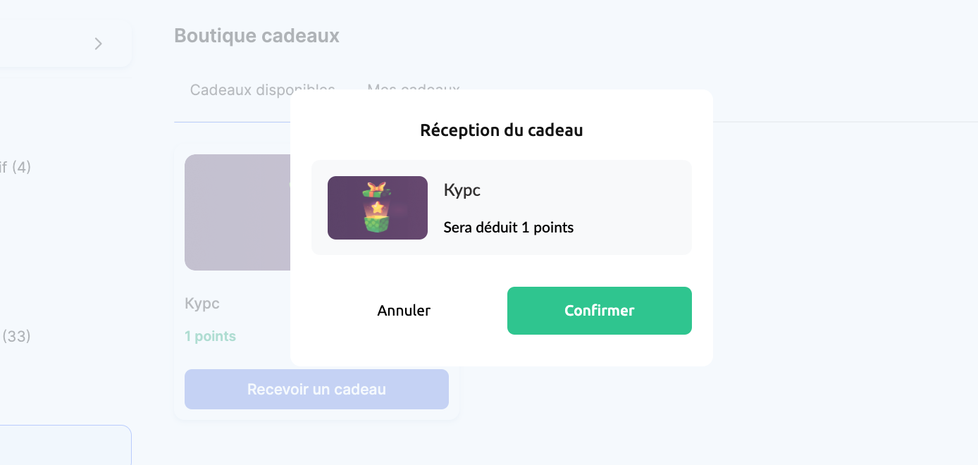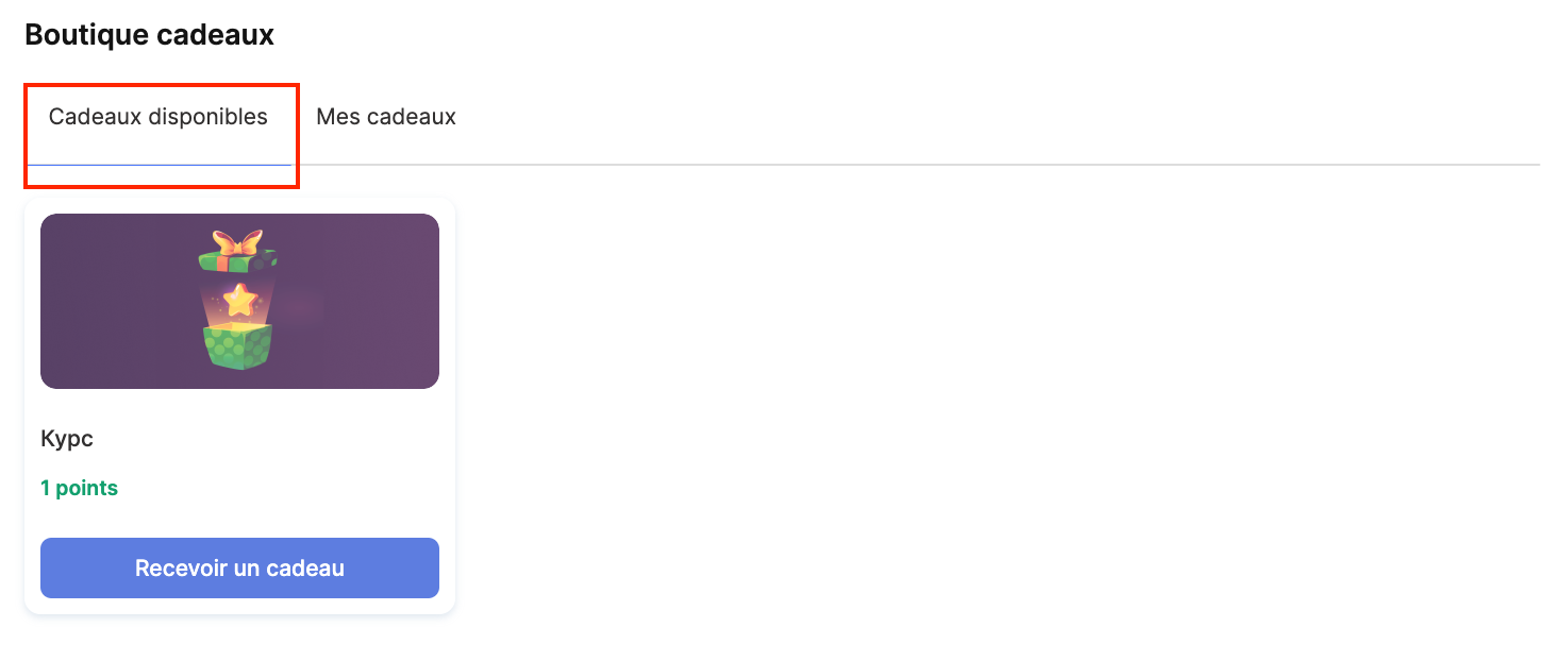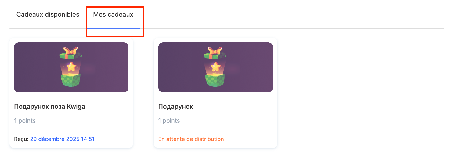 En mode automatique, l’accès est accordé immédiatement. Si la confirmation de la livraison du cadeau est définie sur « Par l’administrateur », le cadeau apparaît dans l’onglet « Mes cadeaux » avec le statut « En attente de livraison ».