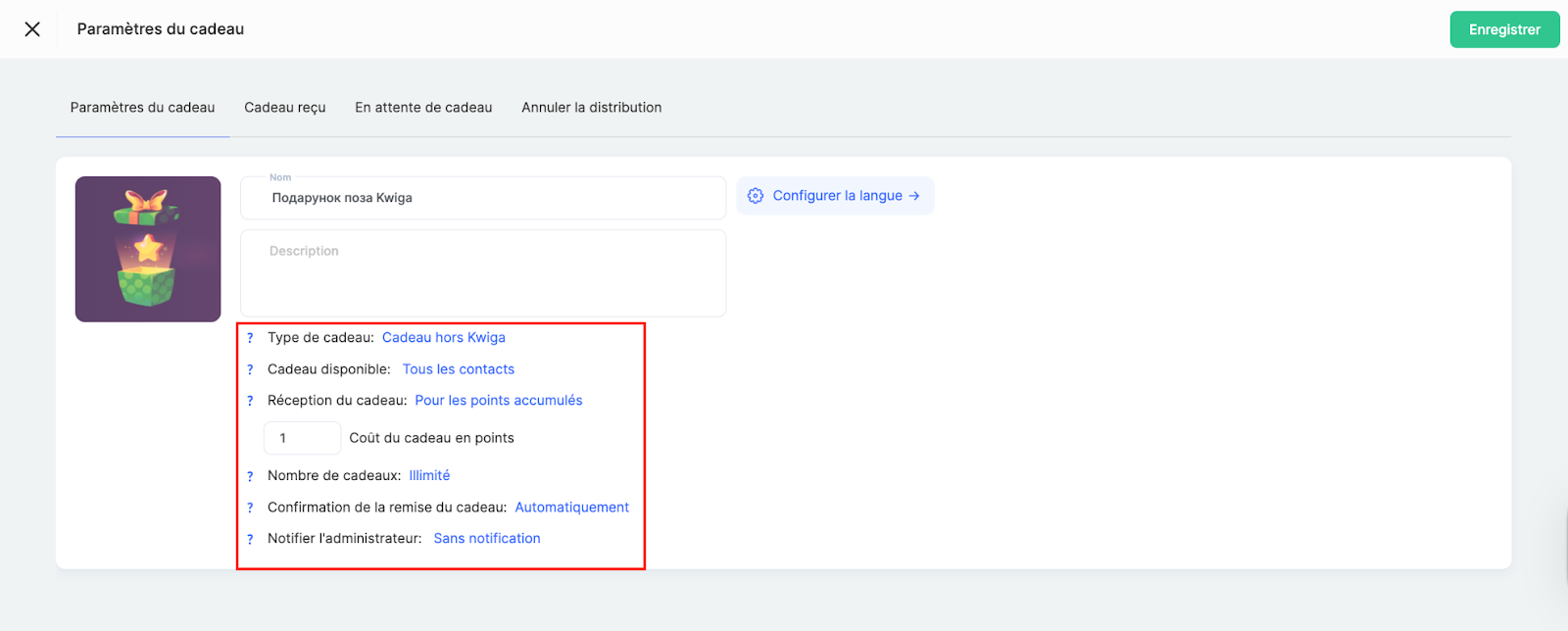 Cadeau en dehors de Kwiga — Vous ajoutez une image et une description du cadeau, puis le remettez au participant via toute méthode externe.