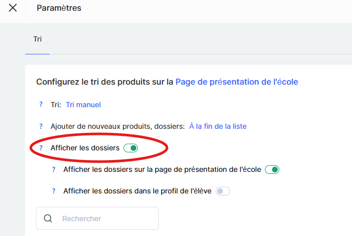 Vous pourrez décider d’afficher ou non les dossiers, ainsi que de les faire apparaître ou non sur la page de présentation de l’école, à l’aide des interrupteurs correspondants.