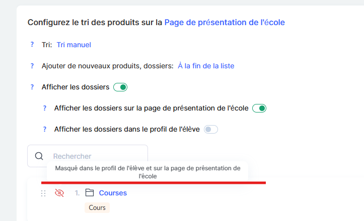 Si vous avez activé l’affichage des dossiers sur la page de présentation de l’école, vous aurez la possibilité d’en masquer certains.