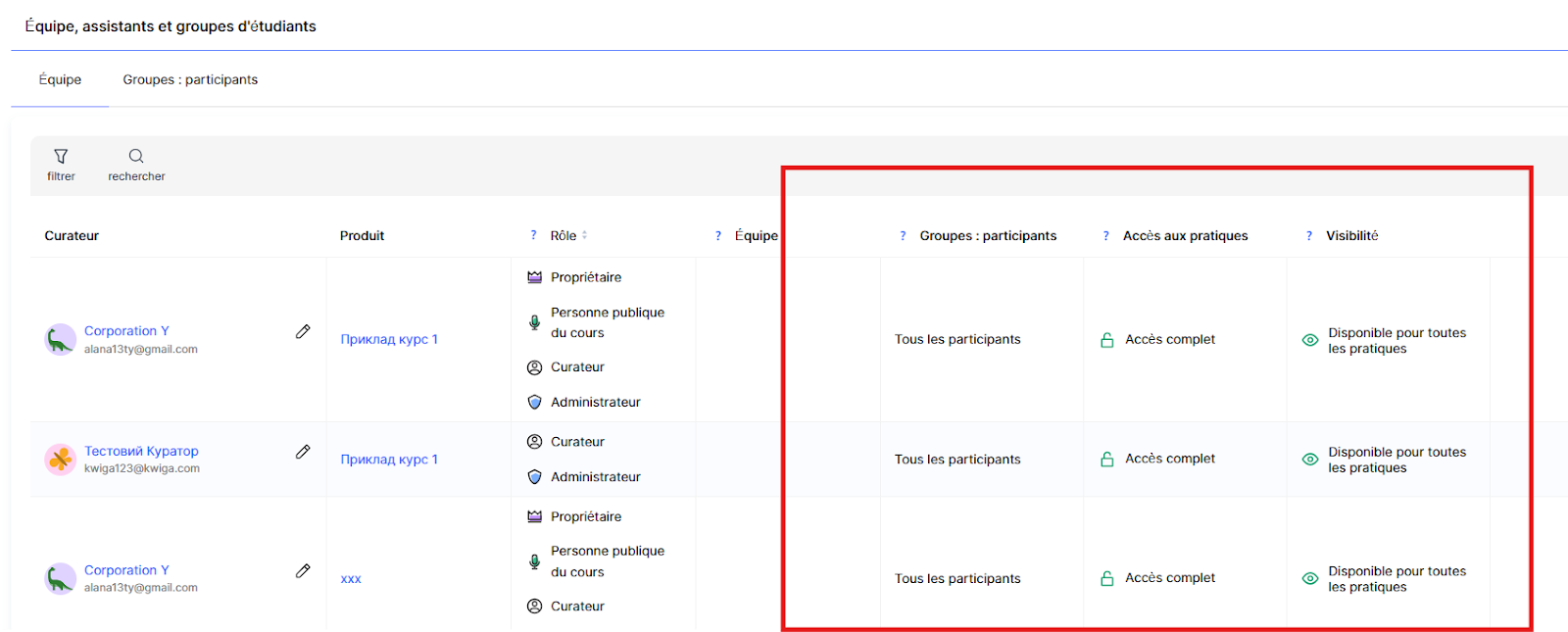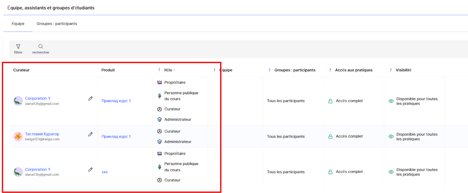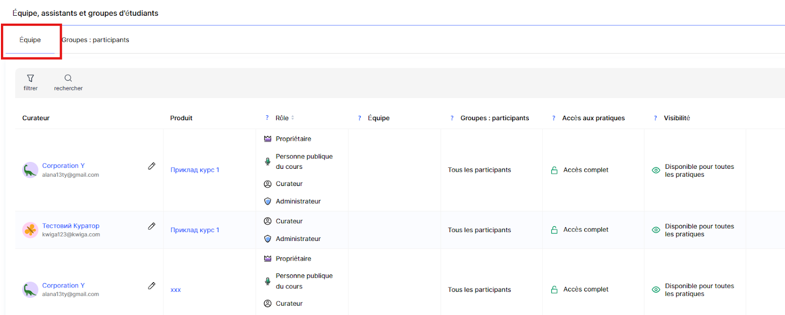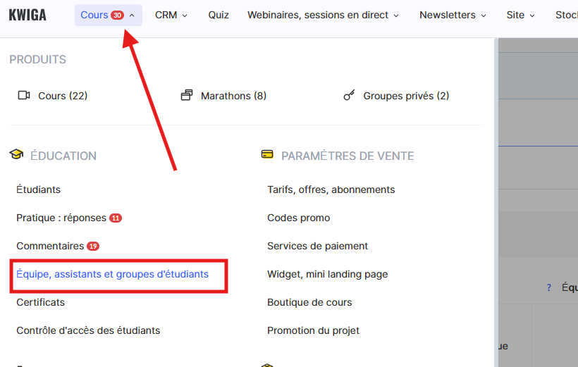 Dans Kwiga, il existe une section dédiée où vous pouvez gérer les assistants, leurs rôles, leurs équipes et l’accès des étudiants.
