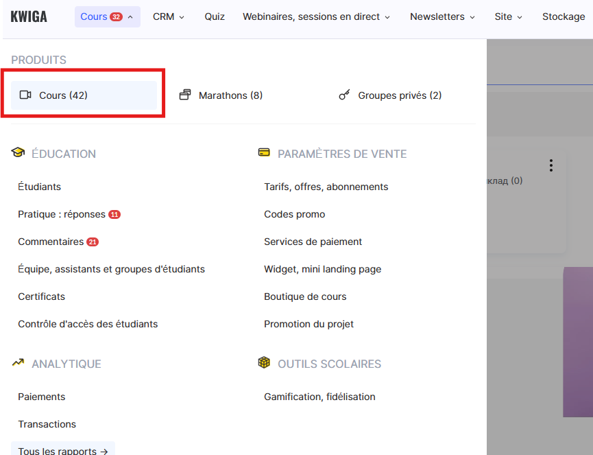 Accéder au menu Cours