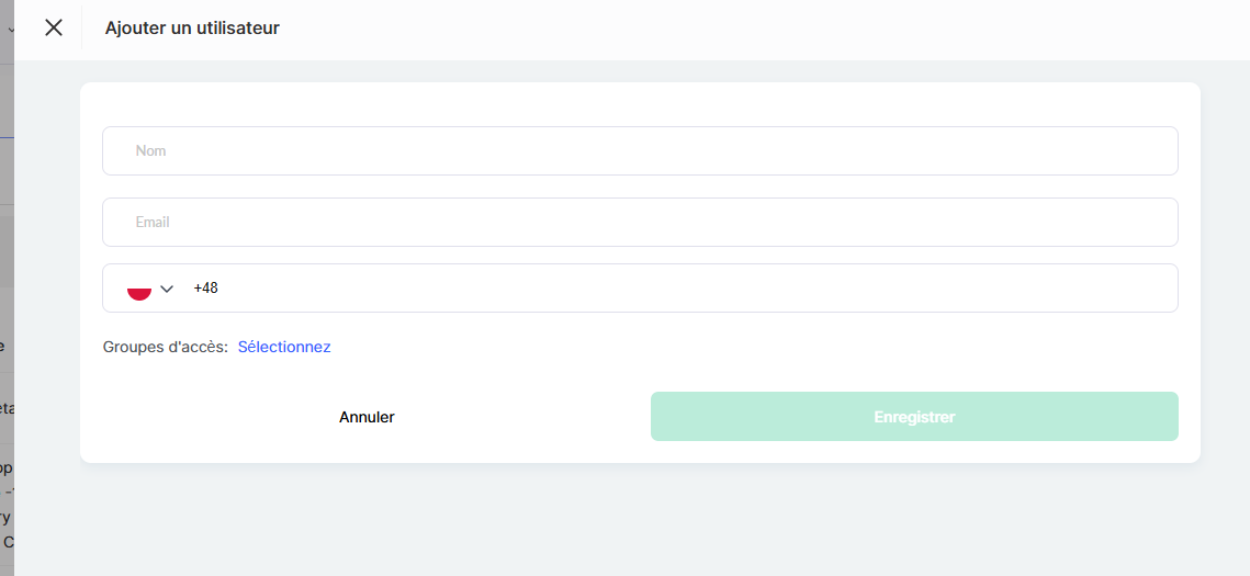 Accédez à l’onglet Utilisateurs et cliquez sur + (Ajouter un utilisateur). Renseignez ensuite les informations suivantes :