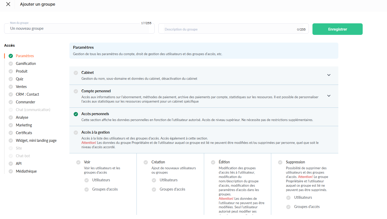 Cliquez sur + (Ajouter un groupe), attribuez-lui un nom (par exemple « Administrateurs », « Superviseurs » ou « Managers », etc.) et utilisez les cases à cocher pour définir le niveau d’accès.