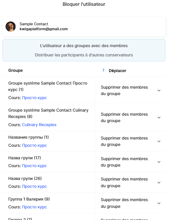 Si l’utilisateur a des groupes avec des participants, ceux-ci doivent d’abord être réattribués à d’autres assistants. Pour chaque groupe, vous pouvez choisir l’une des options suivantes :
