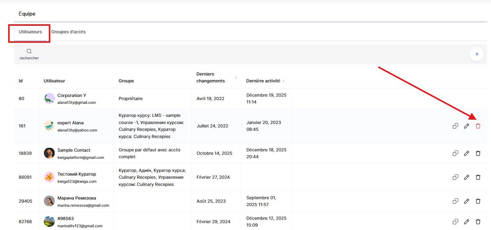 Dans la liste, trouvez l’utilisateur que vous souhaitez supprimer. À côté de son nom, vous verrez une icône de corbeille. Cliquez dessus pour lancer le processus de suppression.