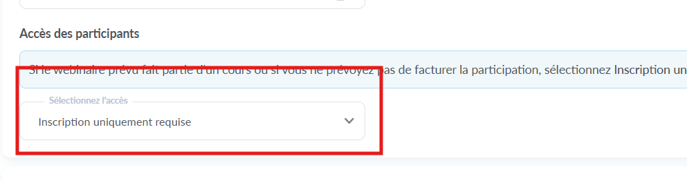 Pour organiser un webinar automatisé gratuit, rends-toi dans la section Accès et inscription et sélectionne l’option Inscription uniquement requise.