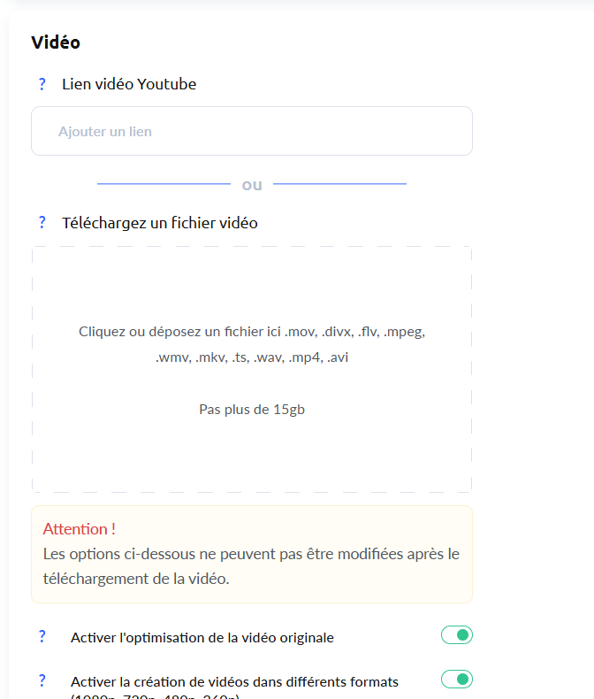 Tu peux télécharger des fichiers jusqu’à 1 Go dans les formats suivants : .mov, .mp4, .3gp, .divx, .flv, .mpeg, .mpg, .wmv, .mkv.