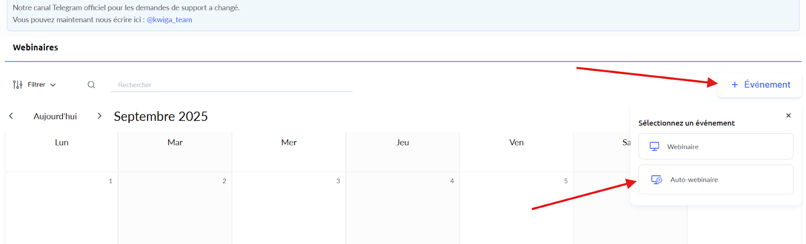 En haut de la plateforme Kwiga, va dans l’onglet Webinars et clique sur Start New. Sur la page qui s’ouvre, clique sur +Event et sélectionne Automated Webinar dans la liste.