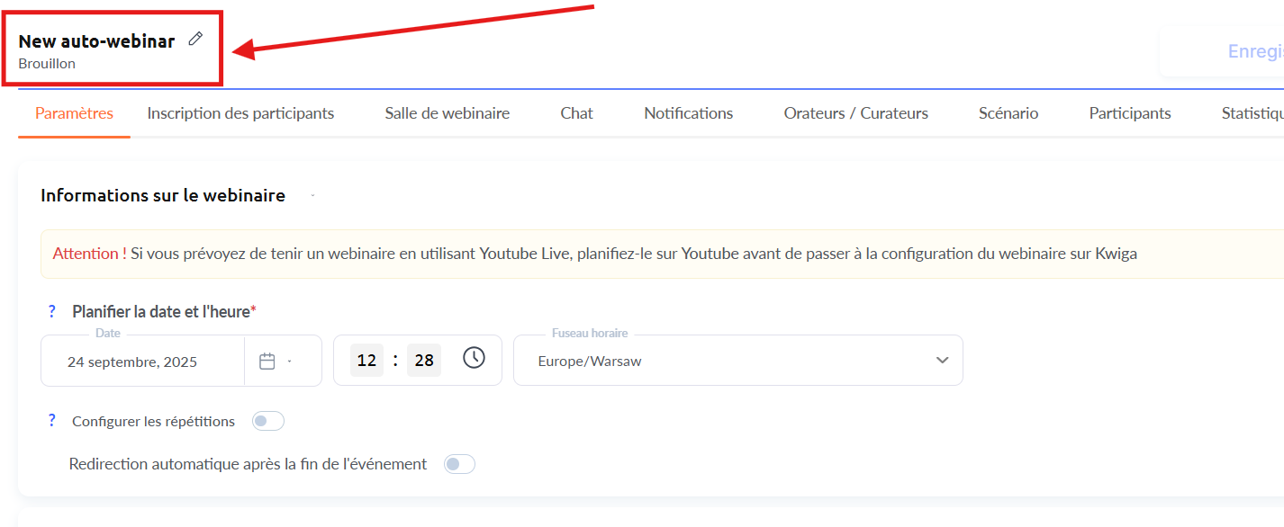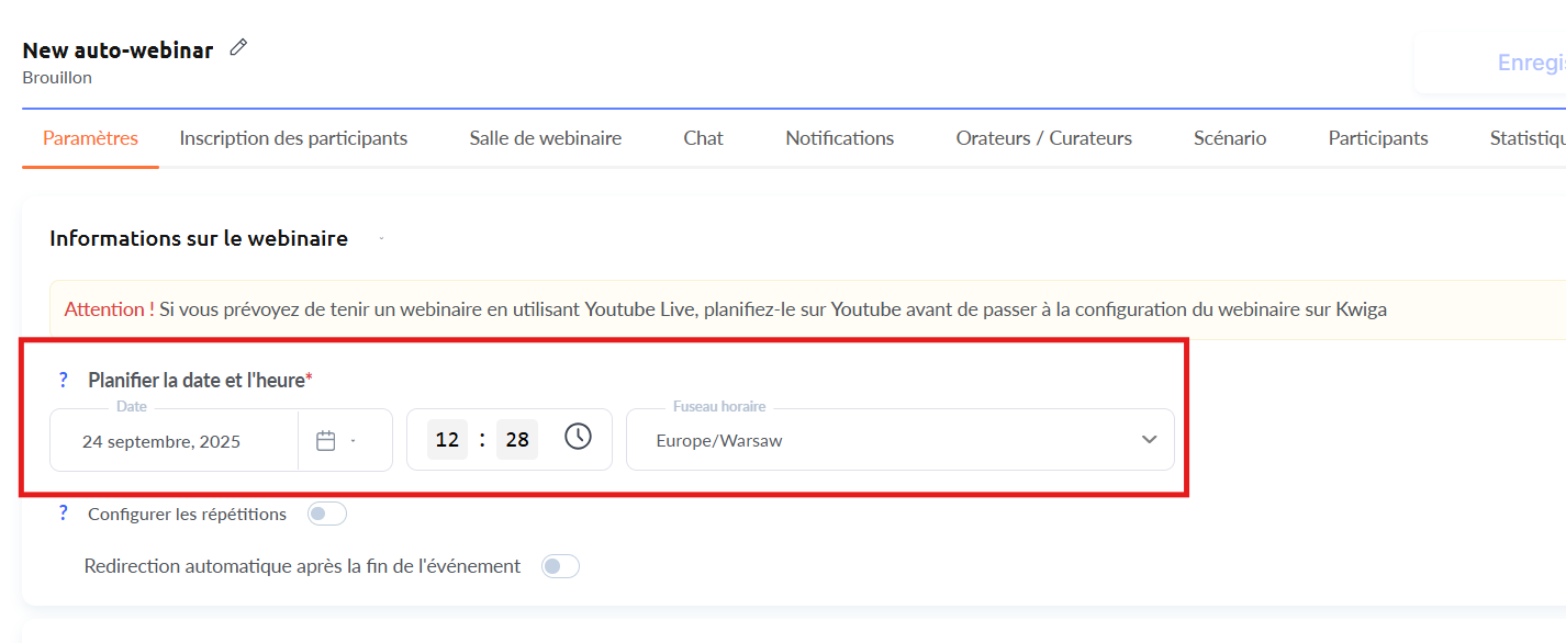 Si tu prévois d’organiser le webinar pour des participants situés dans un autre fuseau horaire (par exemple, dans un autre pays), tu devras accorder une attention particulière à ce point.