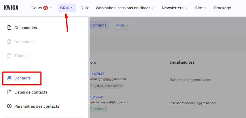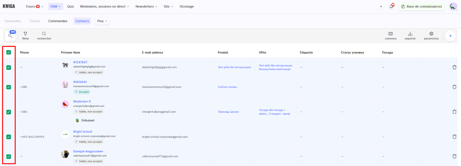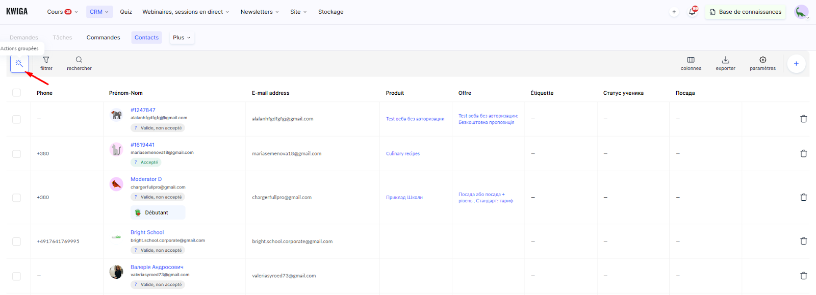 Dans le CRM Kwiga, vous pouvez apporter des modifications à un grand nombre de contacts en une seule fois. C’est pratique lorsque vous devez mettre à jour des données, modifier des étiquettes ou accorder l’accès à un produit pour un groupe spécifique de clients.