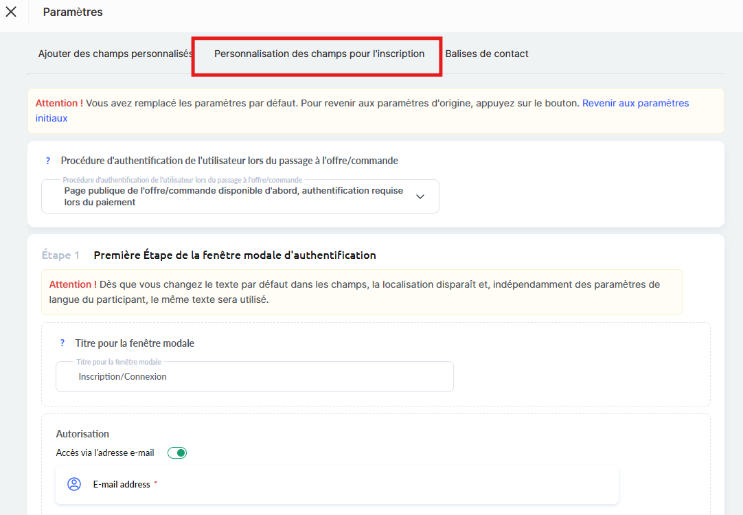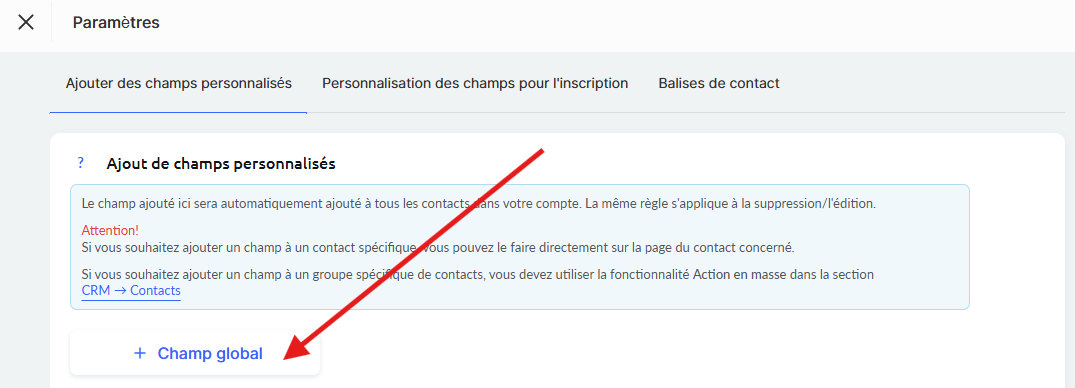 Retourne dans CRM → Contacts → Paramètres, mais ouvre cette fois l’onglet Personnalisation des champs pour l’inscription.