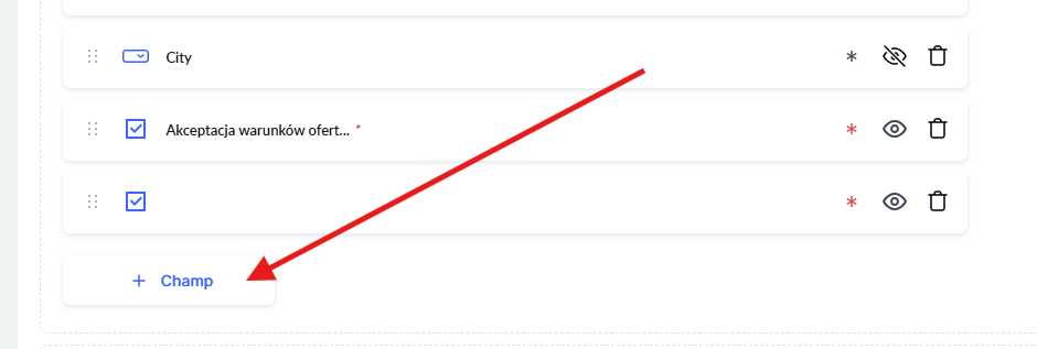 Ici, tu peux sélectionner les champs qui apparaîtront dans le formulaire. Utilise le bouton + Champ pour ajouter des champs personnalisés. Indique quels champs doivent être obligatoires (ils seront marqués d’un astérisque).