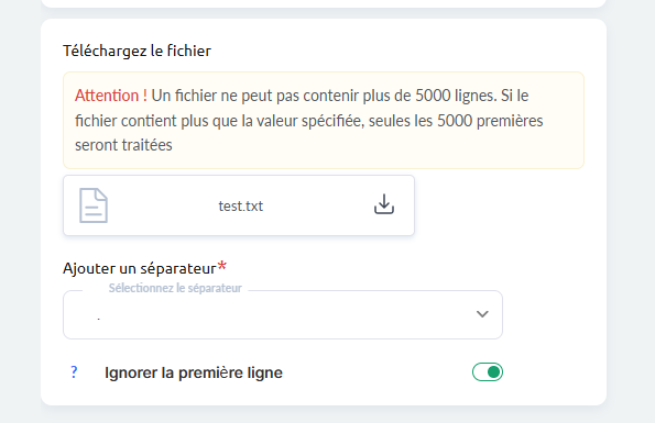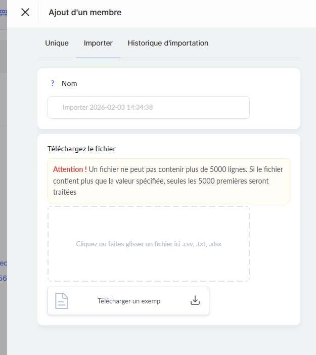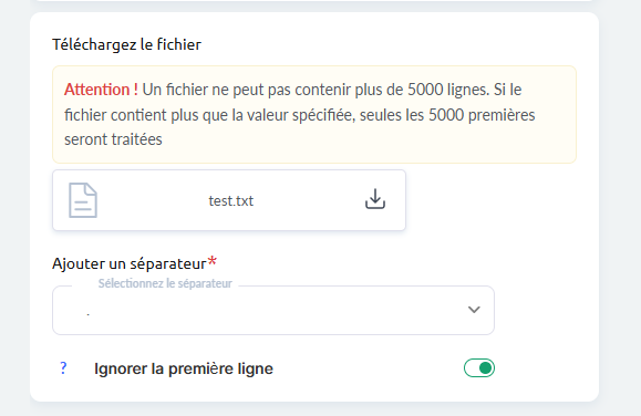 Si le fichier contient plus de 5 000 lignes, le système ne traitera que les 5 000 premières entrées. Un fichier d’exemple est disponible au téléchargement afin de garantir le bon format.