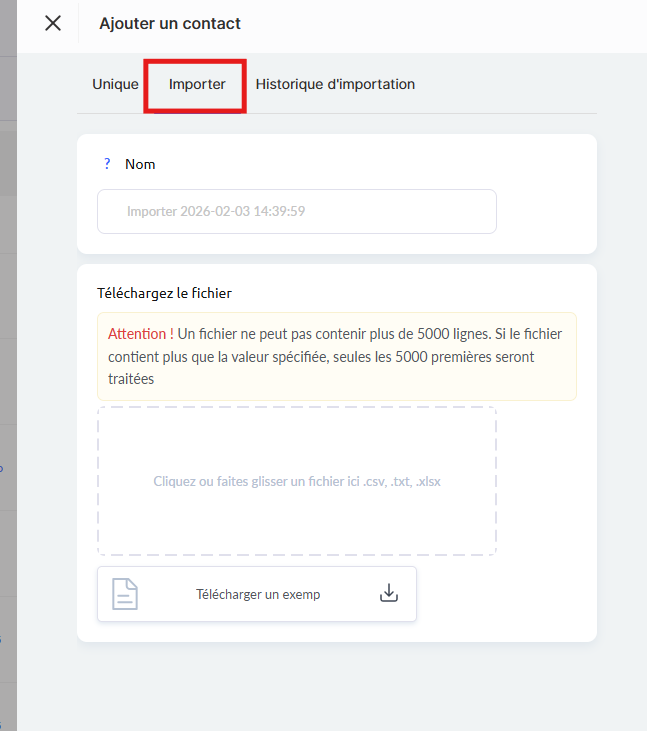Si le fichier contient plus de 5 000 lignes, seules les 5 000 premières entrées seront traitées. Un fichier d’exemple est disponible afin de garantir le bon format. L’importation prend en charge aussi bien des listes d’adresses e-mail que des tableaux détaillés avec des données personnelles, des liens vers les réseaux sociaux et des notes supplémentaires.