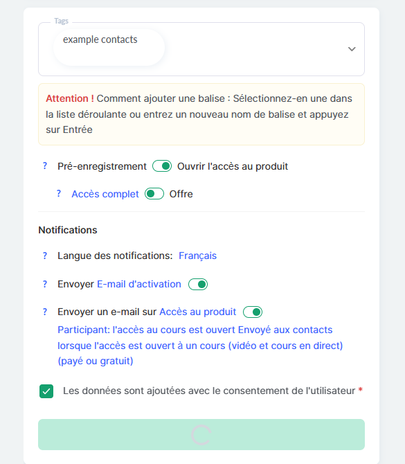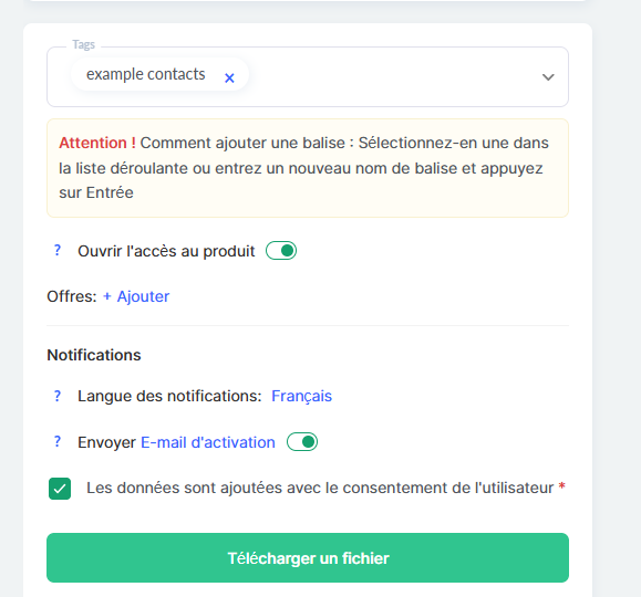 À cette étape, vous pouvez ajouter des tags à tous les contacts du fichier, leur accorder l’accès à un produit et sélectionner l’offre correspondante.