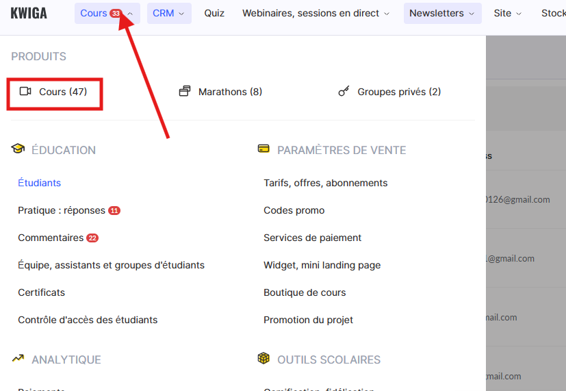 Sur la plateforme Kwiga, la gestion des contacts et des étudiants est simple et intuitive. Vous pouvez choisir entre deux options pour le transfert en masse des contacts : importer directement dans un cours ou transférer la base de données vers le CRM.