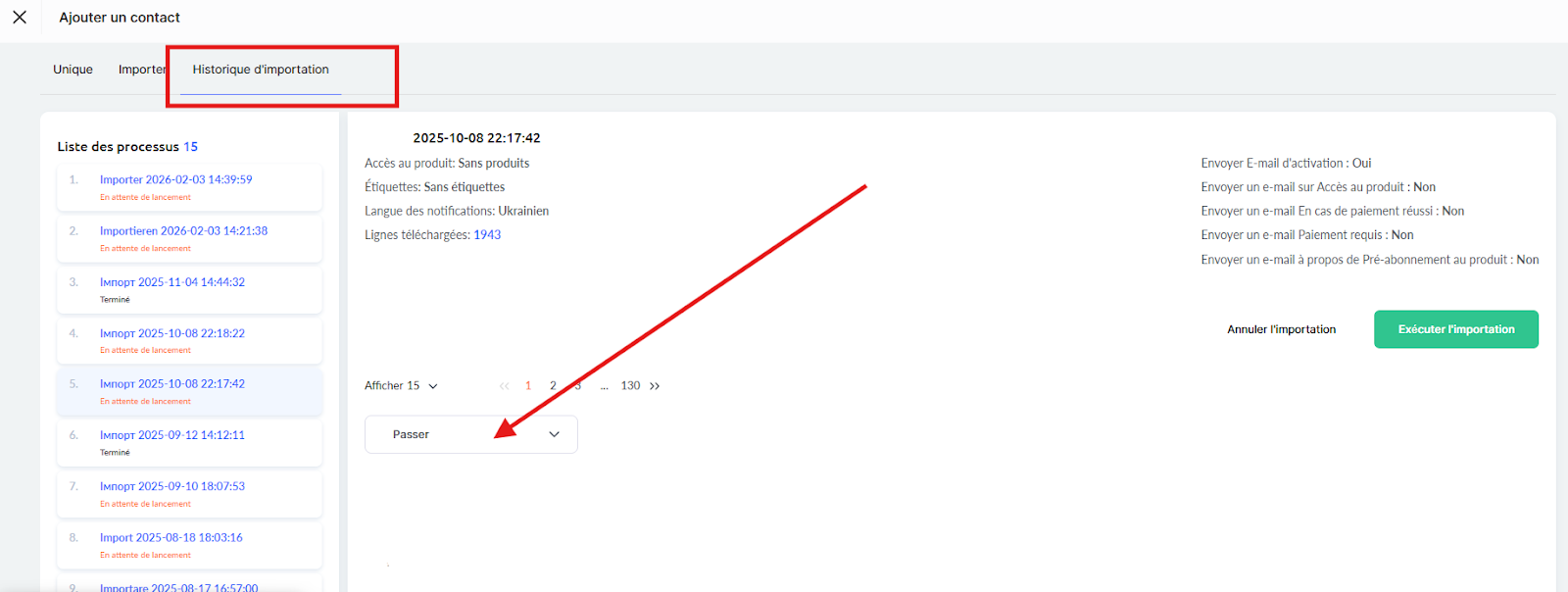 Le système commence à traiter les données ; selon la taille du fichier et le nombre de contacts, ce processus peut prendre quelques secondes.